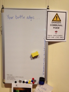 Anyhow. Before putting down the pen and swanning off to warmer climes, I set a new challenge to the coffee worshippers who frequent The Bean Barn: write a communal poem. I left a single line on the whiteboard in the cafe to start it off (without any idea of where it might go): ‘Your brittle edges…’ Then I invited the good folks of Ballarat to add one line each. That’s the only rule – one line. I thought it’d be interesting to see what came of those edges in three weeks’ time.